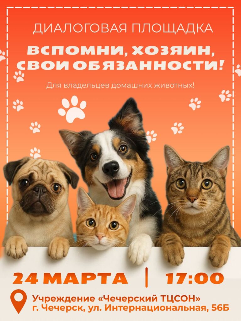 Жителей района 24 марта в 17.00 приглашают на диалоговую площадку в ТЦСОН, где вместе с экспертами будут обсуждаться правила содержания домашних животных, какие штрафы грозят нерадивым хозяевам за самовыгул и выброшенных животных, а также возможные решения проблемы.