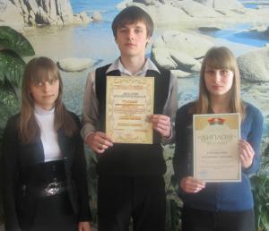Успех принесли в стены гимназии ребята, которые приняли участие в областных конкурсах и вернулись в родное учебное заведение с дипломами. Ирина Корнеенко и Александра Атрощенко (руководитель И.М.Потапенко) награждены дипломами 3 степени за участие в конкурсах «Знай и люби русский язык» и риторического мастерства в г. Гомеле, а Михаил Мамекин (руководитель Н.И.Лагойкин) награжден дипломом 3 степени на республиканском конкурсе научных работ «Библейские сюжеты в мировом искусстве», который прошел в г. Минске.
