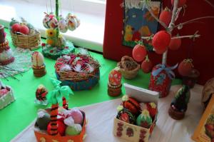 Еще в преддверии празднования Воскресения Христово Лариса Яковлевна совместно со своими подопечными оформила необыкновенную пасхальную выставку, где каждая поделка очаровывает своей неповторимостью. Говорить об их красоте – значит не сказать ничего, это нужно увидеть. Здесь нашли свое место как штучные изделия, так и сюжетные композиции. Конечно же, главным атрибутом православного праздника является яйцо. Интересна сама идея воплощения и использованный материал – яичная скорлупа, нитки, веточки, а также другие дары природы. Доставляет большое удовольствие лицезреть экспозицию, ведь прекрасное возвышает человека.