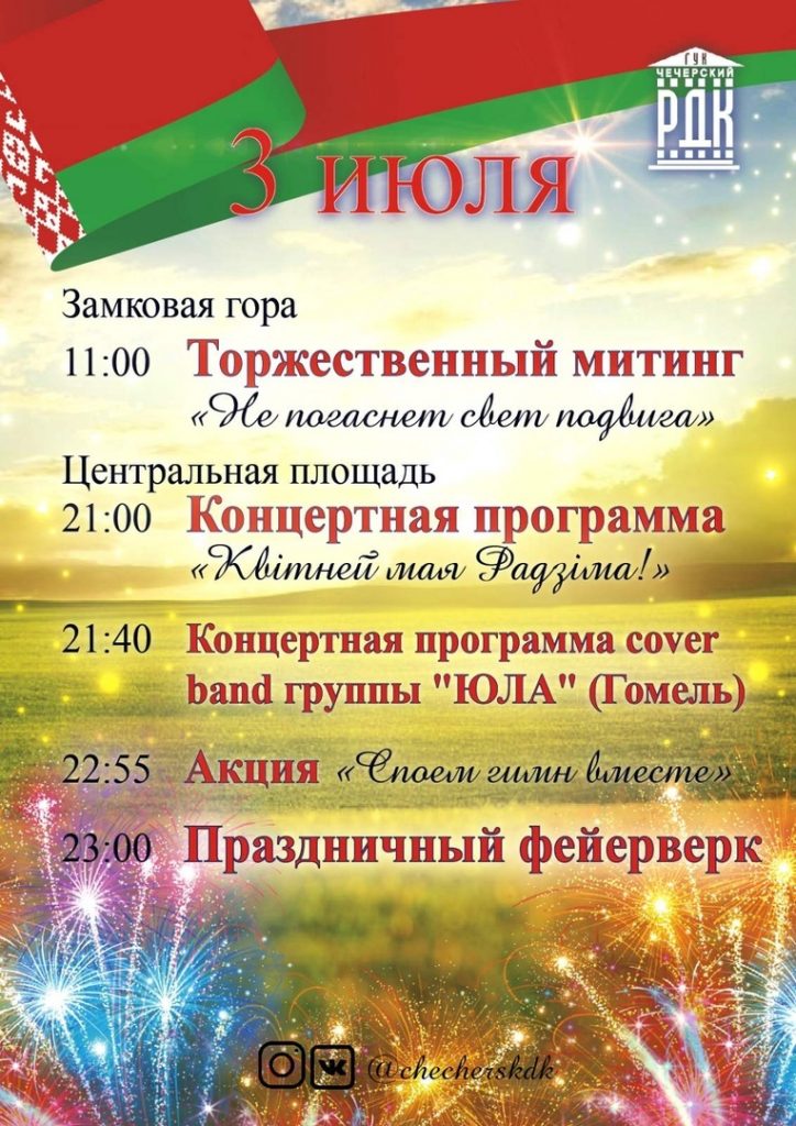 В 22.55 состоится акция с многолетней традицией – «Споем гимн вместе». А в 23.00 над Чечерском прозвучат залпы праздничного фейерверка.
