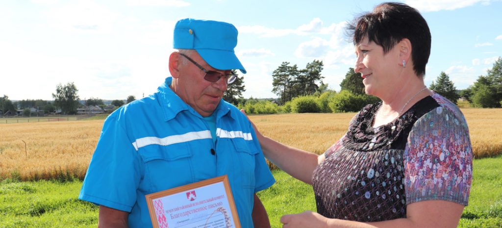 По такому случаю прямо в поле чествовали передовика. Глава района Юрий Деркачев, директор хозяйства Галина Трибунах и председатель райкома профсоюза работников агропромышленного комплекса Анжелика Кравченко вручили тысячнику благодарственные письма и подарки. Лучшего водителя поблагодарили за добросовестный труд. А артисты районного Дома культуры подарили первому герою жатвы-2020 песни.
