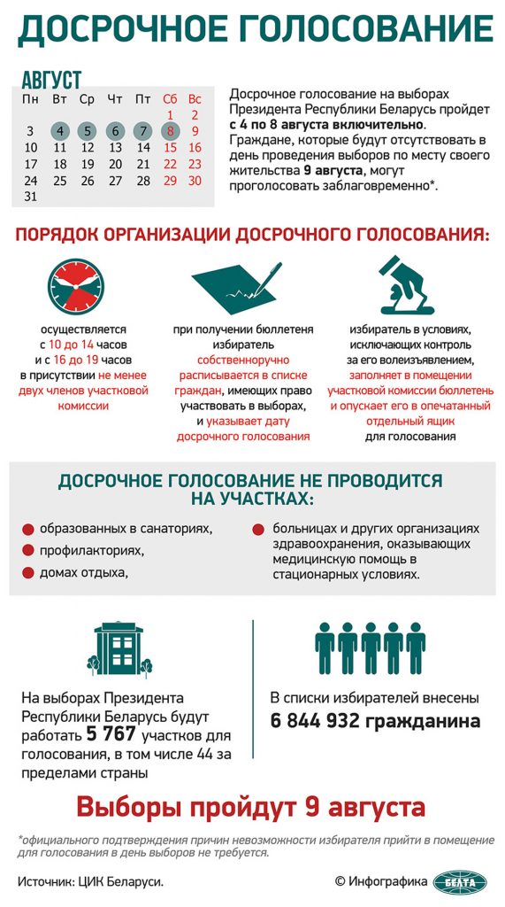 Досрочное голосование на выборах Президента Республики Беларусь пройдет с 4 по 8 августа включительно. Граждане, которые будут отсутствовать в день проведения выборов по месту своего жительства 9 августа, могут проголосовать заблаговременно*.