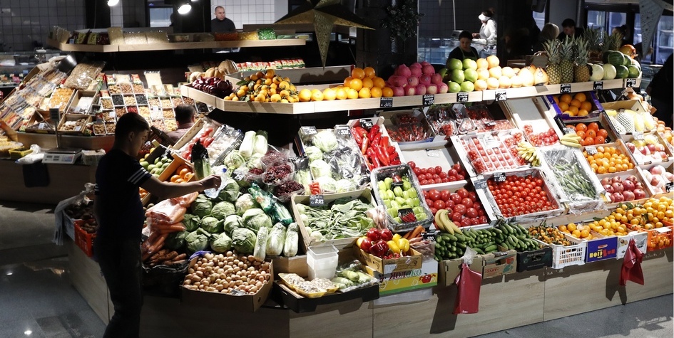 MOSCOW, RUSSIA - DECEMBER 17, 2017: A man sells fruits and vegetables at the Tsentralny [Central] market in Moscow's Rozhdestvensky Boulevard. Artyom Geodakyan/TASS Ðîññèÿ. Ìîñêâà. 17 äåêàáðÿ 2017. Ïðîäàæà ñâåæèõ îâîùåé è ôðóêòîâ íà Öåíòðàëüíîì ðûíêå íà Ðîæäåñòâåíñêîì áóëüâàðå. Àðòåì Ãåîäàêÿí/ÒÀÑÑ