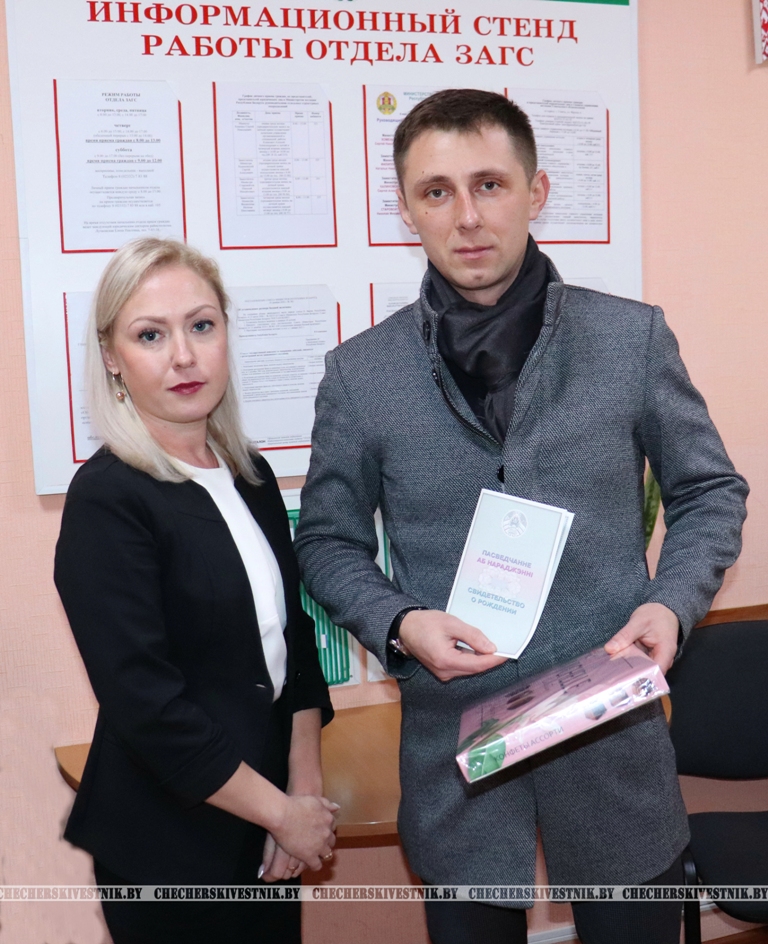 Этот день рождения для Чечерского отдела ЗАГС особенно примечательный. В его преддверие состоялось 100-я регистрация рождения. Это радостное событие впервые произошло в семье Журбиковых. Для маленького Марка – это первый в жизни государственный документ. Начальник ЗАГСа Наталья Николаевна произнесла теплые и сердечные слова в адрес маленького чечерянина и пожелала ему вырасти достойным гражданином.