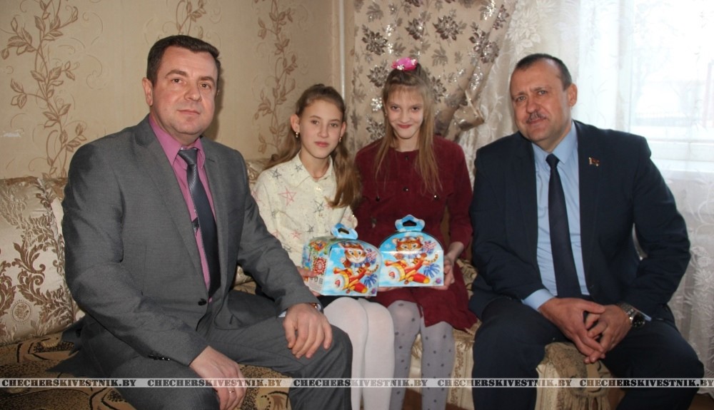 Глава депутатского корпуса Сергей Малюков вместе с депутатом по Колхозному избирательному округу Александром Ганжиным поспешили зажечь радостные искорки в глазах Эвелины и Юлии Козловых из Чечерска. Девочки воспитываются в приемной семье, окружены родительским теплом и заботой, но очень рады были встречать на пороге своего дома гостей и с удовольствием сфотографировались на память.