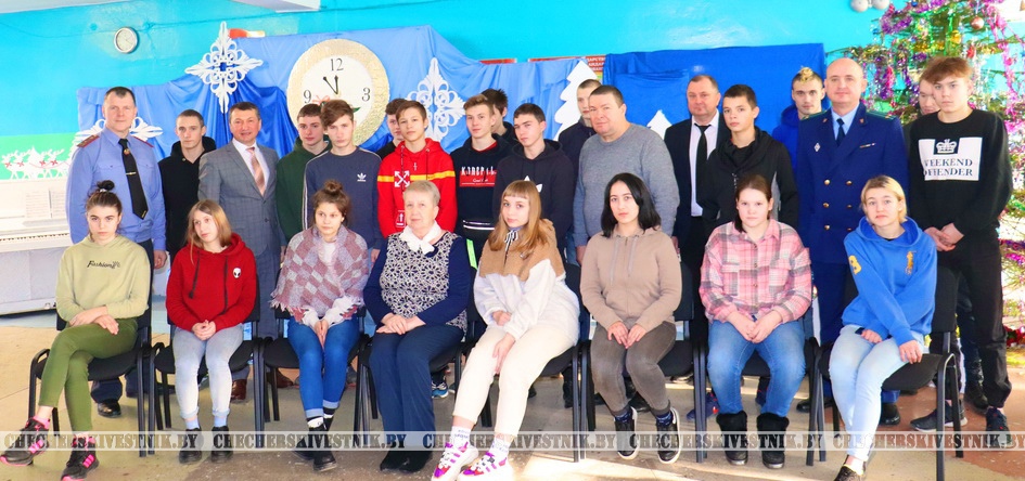 По этому поводу ненадолго прервали свои рабочие дела и посетили профессиональный лицей заместитель председателя комиссии по делам несовершеннолетних Гомельского облисполкома Евгений Миткевич, председатель правления Гомельского областного отделения Белорусского детского фонда, ветеран органов прокуратуры Вера Замойская, прокурор Чечерского района Виктор Семенцов, руководитель районной организации Красного Креста на Чечерщине Светлана Смирнова, заместитель председателя КДН Александр Свежинцев и начальник РОВД Владимир Бухавцов.