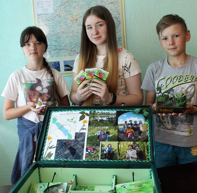 В результате проделанной работы «Мотневичские зубры» составили экологическую экспозицию. «Зеленый чемодан» включил в себя карту-схему и отчет об исследовании участка; фотоальбом с информацией о травянистых растениях; набор ламинированных образцов листьев деревьев и кустарников, а также фотографии, отображающие животный мир; декоративное ароматическое саше с водной мятой, заготовленной на берегу водоема Маглышино; макет участка водоема с характерной растительностью; два набора для складывания пазлов с местными представителями животного мира; набор карточек для игры «Найди пару», на которых изображены местные растения и животные.