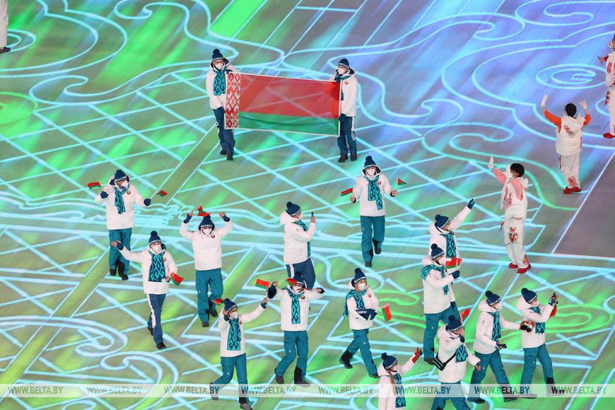 Праздничное шоу проходит на Национальном стадионе китайской столицы, который также называют “Птичьим гнездом”. Игнат Головатюк и Анна Нифонтова пронесли Государственный флаг Беларуси на параде спортсменов.