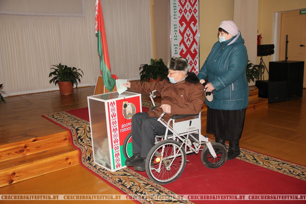 Выразить свое мнение относительно поправок в Основной закон досрочно пришли на участки для голосования Александр Иосифович Новичок и Татьяна Ефимовна Блохова в сопровождении социальных работников.