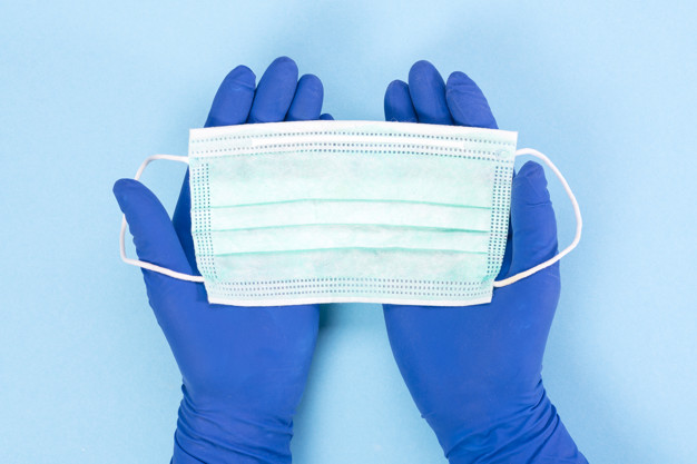 Disposable medical mask in the hands of a doctor on a blue background, pandemic concept. KOVID-19, coronavirus. The global epidemic of the disease. COVID Dangerous Virus.