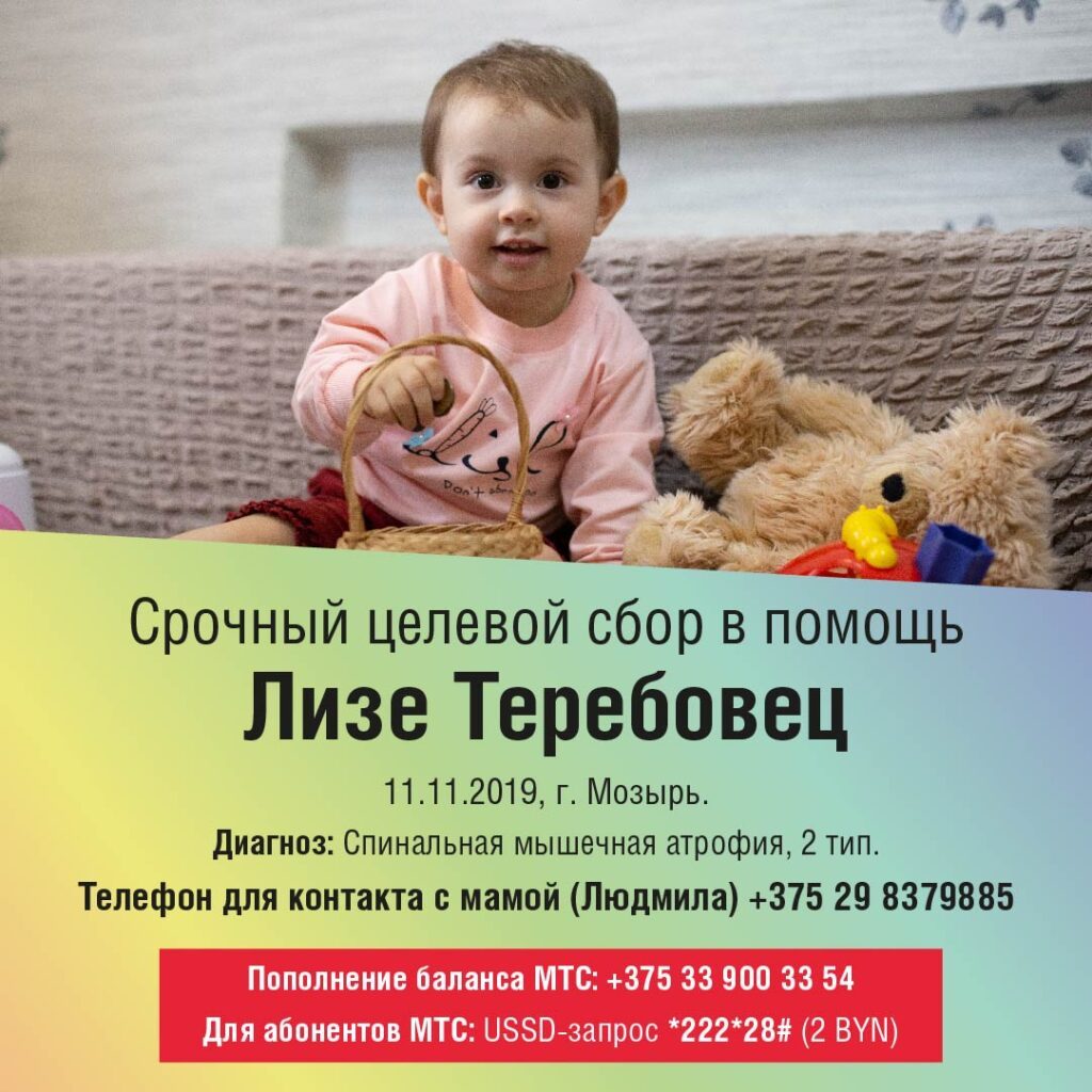 Сейчас внешне Лиза выглядит здоровым ребенком, она жизнерадостна, с интересом познает мир, как все ее ровесники. Пока только не понимает, почему ножки такие слабенькие. Болезнь беспощадна: будет забирать и другие обычные человеческие способности. Не просто тяжело, а невыносимо понимать это родителям и близким. Еще страшнее не использовать единственный шанс, который появился в нашем прогрессивном мире, а имя ему — «Золгенсма». Этот препарат способен остановить заболевание: он доставляет в организм «рабочую копию поломанного гена». Спасительный препарат не зарегистрирован на территории Республики Беларусь и приобретается пациентом за личные средства. Его стоимость — 2.274.031 долларов США. Укол разовый, то есть необходима одна инъекция на всю жизнь. Сейчас мы ведем сбор денежных средств, который продвигается очень медленно. На данный момент собрали 8,26%, что в денежном эквиваленте составляет 187 788,39$.