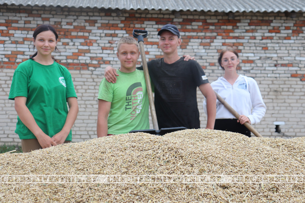 Хозяйство в нынешнем уборочном сезоне приняло на работу 13 школьников и студентов. Среди тех, кто решил помочь сельскому хозяйству, будущий спасатель Сергей Дроздов. Парень проходит обучение в Гомельском государственном машиностроительном колледже по специальности «Предупреждение и ликвидация чрезвычайных ситуаций». Сразу после летней сессии решительно настроился не сидеть у родителей на шее. От редакции: экономить семейный бюджет собственным трудом – по-мужски. Подзаработать на зернотоке Сергею предложила родная тетя. А тот, не раздумывая, согласился. «Работа хоть и пыльная, но для меня не тяжелая. Сил и энергии хватает. Стараюсь направить их в нужное русло. Поэтому тружусь в две смены», – рассказал парень. Рядом с ним с огромной лопатой мальчишка, на вид – школьник. Знакомимся. Виктор Дробышевский из гимназии. Интересуемся, как добираются? «На автобусе. Подвоз организован и туда и обратно», – пояснили ребята. А как с обедами? «С этим и вовсе проблем нет. Дважды в день можно сытно поесть. Полноценный обед с первым, вторым и компотом стоит всего 60 копеек», – рассказали мальчишки. (Где бы в городе найти такую стоимость за обед, проговорила я). Но вот девочки, которые усердно сметали зерно и были менее общительными, со мной не согласились. Они всегда привозят перекус из дома. Говорят, что не надо выжидать время, когда привезут обед, и домашняя еда для них все же вкуснее. Хозяюшки, сразу видно! Девчонки, к слову, работают по сменам и их это вполне устраивает. К тому же, руководитель хозяйства обещал неплохую зарплату.