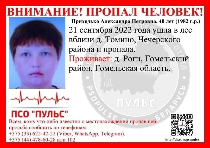 Обстоятельства: 21 сентября 2022 года ушла в лес вблизи д. Томино, Чечерского района и пропала.