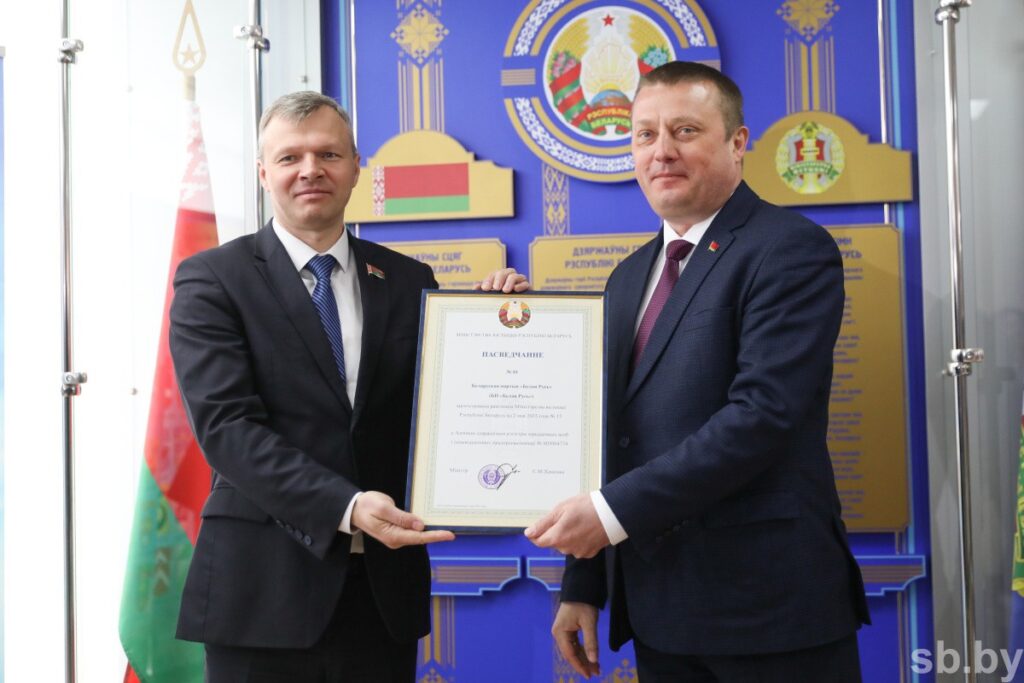 Торжественная церемония получения свидетельства о регистрации Белорусской партии “Белая Русь” прошла в Министерстве юстиции. Министр юстиции Сергей Хоменко вручил Олегу Романову свидетельство о регистрации и устав партии.