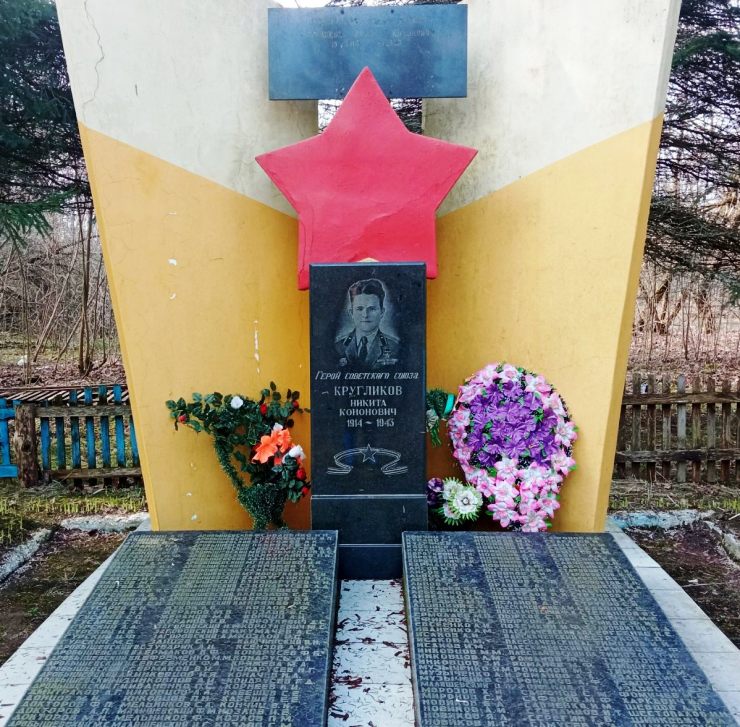 Внимание на памятнике привлекает фотография Героя Советского Союза Никиты Кругликова. Хоть он родом из Залесья, но на момент фашистской оккупации его родители жили в Крутом. Отсюда же деревенский паренек ушел бить врага. Командир танка Т-34 гвардии лейтенант Кругликов погиб в одном из боев под Житомиром. Он пожертвовал собой во имя жизни своих односельчан, земляков, родных и всего советского народа.