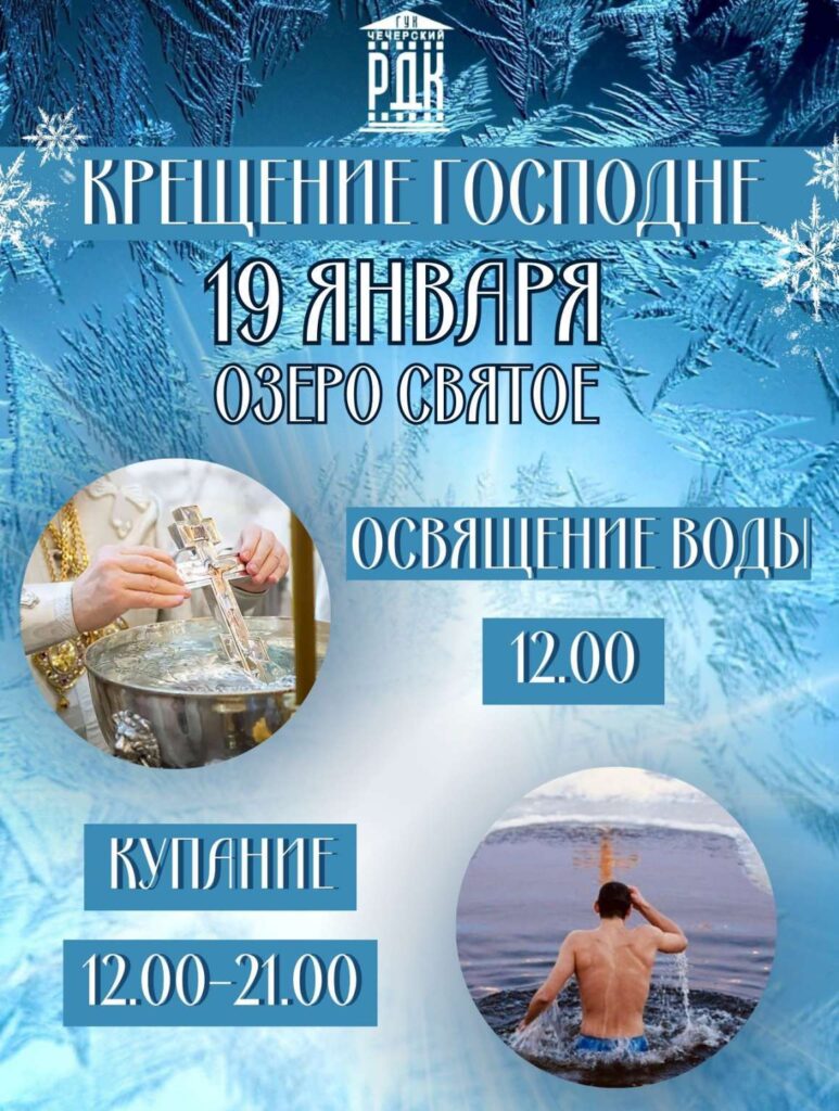 Анонс 19 января на озере Святое пройдет праздник Крещения Господня 17.01.2024 В Чечерске 19 января на озере Святое пройдет праздник Крещения Господня. Начало в 12.00. Следить за безопасностью будут спасатели, представители ОСВОДа и медработники. Купания в других местах строго запрещены. Поделиться информацией: Continue Reading Previous Расписание Крещенских богослужений на ЧечерщинеNext Что можно посмотреть в кинотеатре “Октябрь” с 24 по 31 января More Stories Анонс Что можно посмотреть в чечерском кинотеатре “Октябрь” с 4 по 7, 10 декабря 01.12.2025 Анонс В Чечерске 29 ноября пройдет областной турнир по дзюдо 28.11.2025 Анонс Что можно посмотреть в чечерском кинотеатре “Октябрь” с 27 по 30 ноября 24.11.2025 Добавить комментарий Отменить ответ Ваш e-mail не будет опубликован.Комментарий Имя E-mail Сайт Δ Этот сайт использует Akismet для борьбы со спамом. Узнайте, как обрабатываются ваши данные комментариев.