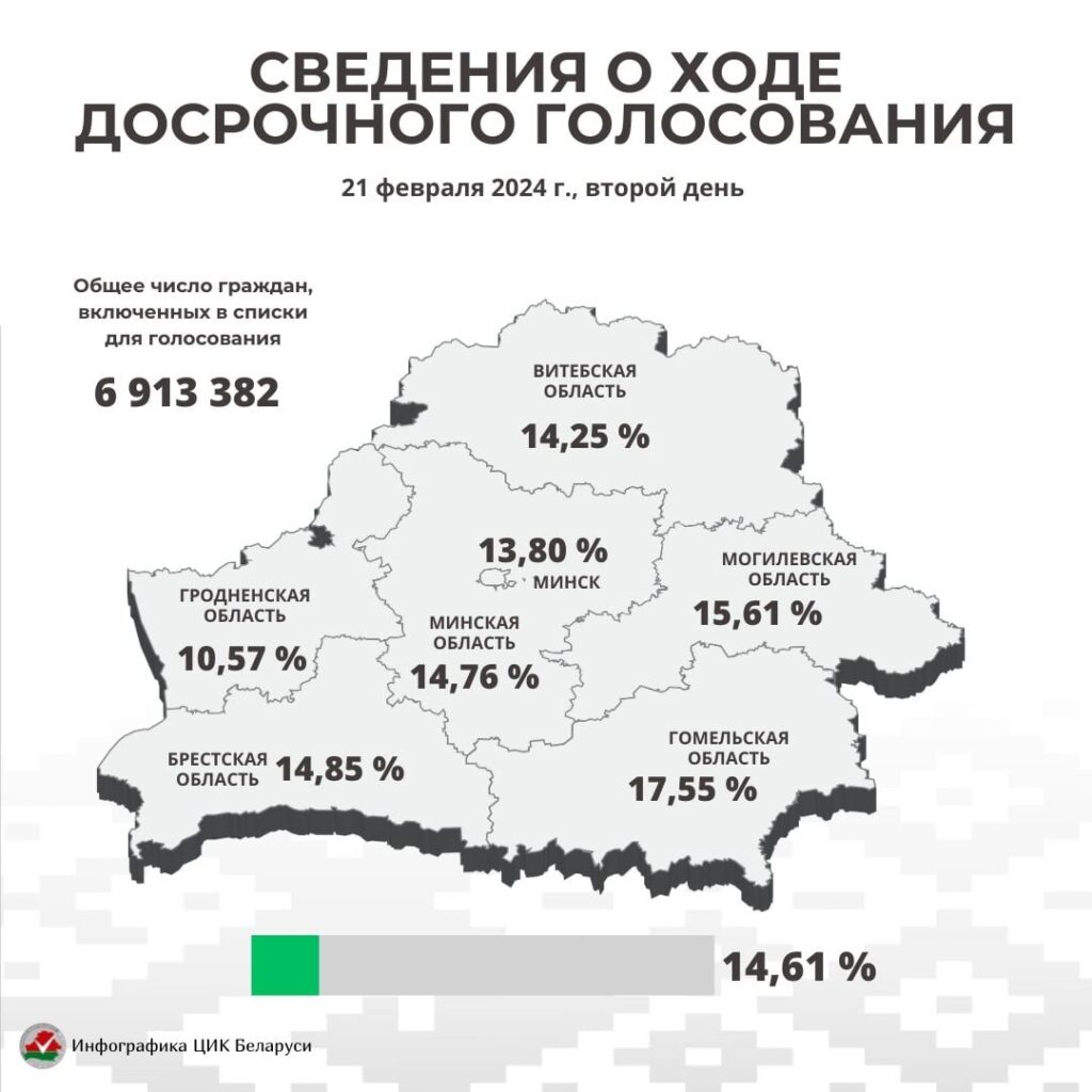 В Брестской области получили бюллетени 14,85 % граждан от общего числа включенных в списки для голосования, в Витебской – 14,25 %, в Гомельской – 17,55 %, в Гродненской – 10,57 %, в Минской – 14,76 %, в Могилевской – 15,61 %, в г.Минске – 13,80 %.