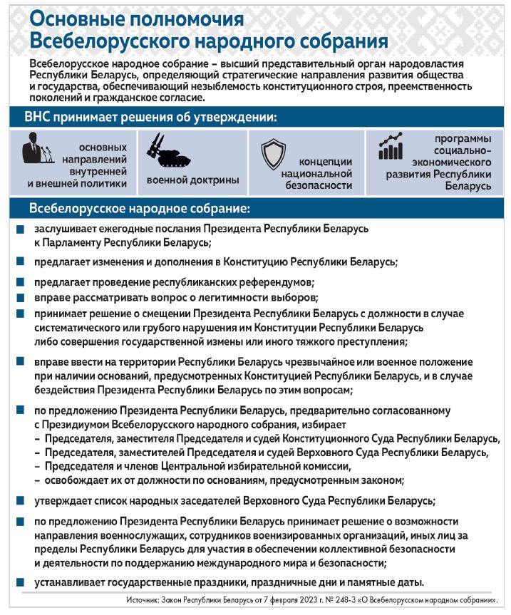 Первое заседание VII Всебелорусского народного собрания состоится 24 — 25 апреля 2024 года. Уже началось выдвижение кандидатов в делегаты ВНС, которое завершится 31 марта, а с 1 по 10 апреля пройдут выборы. При этом стратегическое значение института, который обрел конституционный статус, все более отчетливо просматривается уже сегодня. И заключается оно в формировании той основы белорусской государственности, которая будет обеспечивать преемственность курса на основе ценностей белорусского государства.